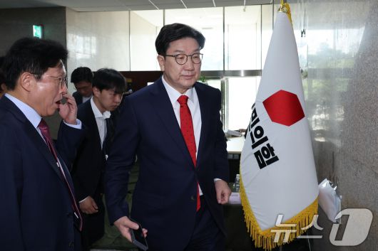 (서울=뉴스1) 안은나 기자 = 단일화 약속을 촉구하며 무기한 단식농성 중인 권성동 국민의힘 원내대표가 8일 오전 서울 여의도 국회에서 김문수 당 대통령 후보의 긴급 기자회견을 보기 위해 원내대표실로 들어서고 있다. 2025.5.8/뉴스1coinlocker@news1.krCopyright ⓒ 뉴스1. All rights reserved. 무단 전재 및 재배포, AI학습 이용 금지.