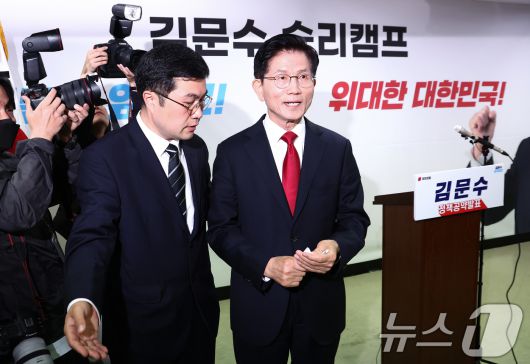 (서울=뉴스1) 김민지 기자 = 김문수 국민의힘 대통령 후보가 8일 오전 서울 여의도 자신의 캠프 사무실에서 단일화 관련 긴급 기자회견을 마친 후 이동하고 있다. 2025.5.8/뉴스1kimkim@news1.krCopyright ⓒ 뉴스1. All rights reserved. 무단 전재 및 재배포, AI학습 이용 금지.