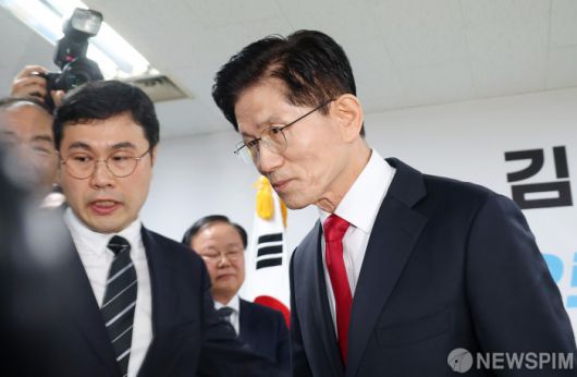[서울=뉴스핌] 정일구 기자 = 김문수 국민의힘 대선 후보가 8일 오전 서울 여의도 선거캠프에서 후보 단일화 관련 긴급 기자회견을 마친 뒤 이동하고 있다. 2025.05.08 mironj19@newspim.com