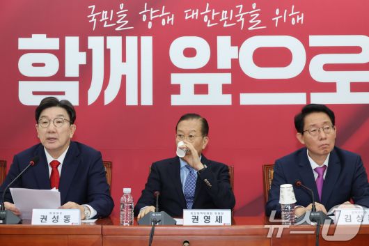 (서울=뉴스1) 안은나 기자 = 권성동 국민의힘 원내대표가 8일 오전 서울 여의도 국회에서 열린 비상대책위원회의에서 발언하고 있다. 왼쪽부터 권 원내대표, 권영세 비대위원장, 김상훈 정책위의장. 2025.5.8/뉴스1coinlocker@news1.krCopyright ⓒ 뉴스1. All rights reserved. 무단 전재 및 재배포, AI학습 이용 금지.