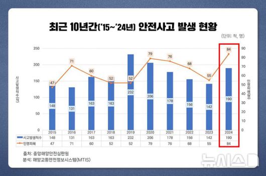 8일 한국해양교통안전공단(KOMSA·이사장 김준석) 해양교통안전정보시스템(MTIS)에 따르면 지난해 해양 안전사고로 인한 인명피해는 총 84명으로, 2015년 이후 10년간 가장 많은 수치를 기록했다. 안전사고 발생 척수도 전년(142척) 대비 33.8% 증가한 190척으로, 감소세였던 해양 안전사고가 다시 증가세에 들어선 것으로 분석됐다.