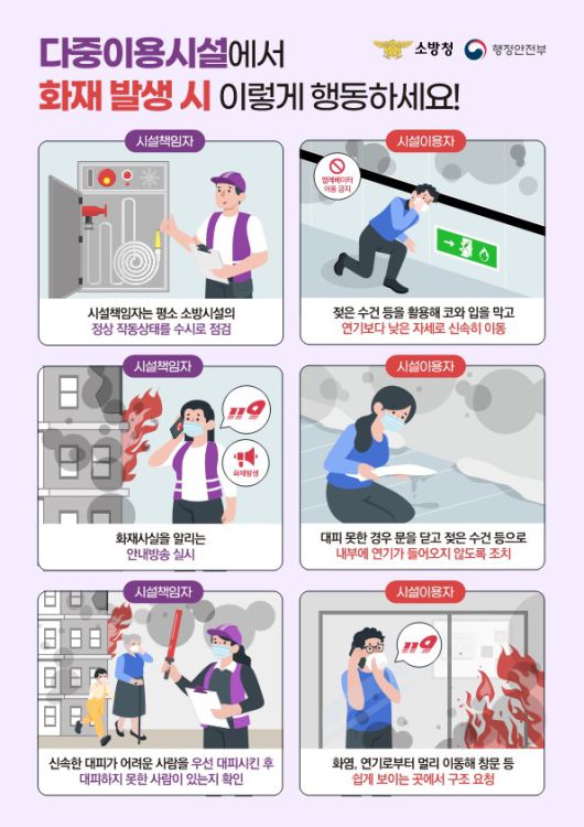 시설이용자는 △엘리베이터는 절대 이용 금지하고 △젖은 수건 등으로 입과 코를 막고 자세를 낮춰 이동 △문을 닫고 연기 유입을 막으며 젖은 천으로 내부에 연기가 들어오지 않게 조치한 뒤 △화염·연기에서 멀리 이동하고 창문 등 구조 요청이 가능한 위치로 이동한다.