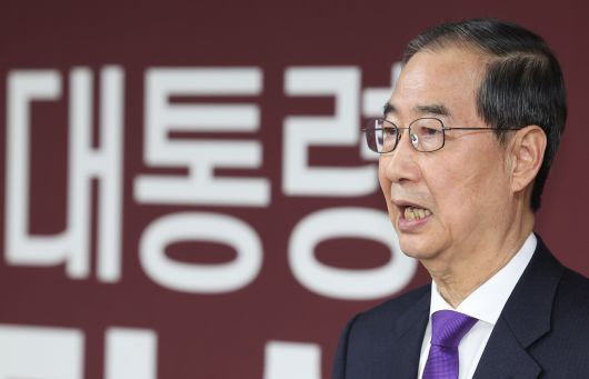무소속 한덕수 대통령선거 예비후보가 7일 서울 영등포구 선거캠프 사무실에서 열린 기자회견에서 대선 단일화와 관련해 발언하던 모습. <연합> |