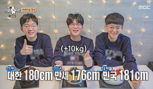 송일국은 이제 중1이 된 삼둥이의 근황을 전한다. “대한이가 180㎝, 민국이는 181㎝, 만세도 176㎝”라며 놀라운 성장 속도를 밝히더니 “1인 1피자는 기본, 10㎏ 밥솥에 밥하면 싹 비운다”고 말한다. 우유 2L짜리 3팩도 며칠을 못 버틴다고.