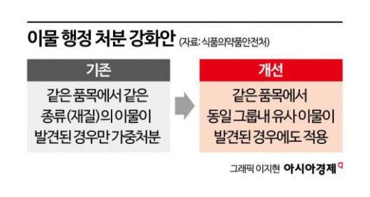 식품의약품안전처는 이물 혼입에 대한 행정처분 기준을 강화하는 내용을 담은 식품위생법 시행규칙 개정안을 다음 달께 입법 예고할 계획이다. 현재는 같은 품목 내에서 동일 재질의 이물(플라스틱-플라스틱)이 반복적으로 검출된 경우에만 가중 처분이 가능했지만, 앞으로는 유사한 이물(유리-플라스틱)도 동일 그룹으로 분류해 처벌 수위를 높일 수 있도록 변경된다.
