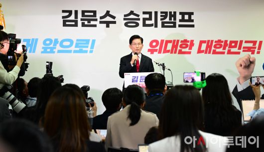 아시아투데이 이병화 기자 = 김문수 국민의힘 대통령 후보가 8일 서울 여의도 캠프 사무실에서 후보 단일화에 관한 입장을 밝히고 있다.