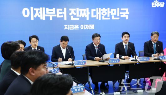 윤호중 더불어민주당 총괄본부장(오른쪽 세 번째)이 8일 오전 서울 여의도 민주당사에서 열린 진짜 대한민국 중앙선대위 총괄본부장단회의에서 모두 발언을 하고 있다. 2025.5.8/뉴스1 ⓒ News1 김민지 기자 |