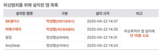 에버스핀이 확보한 실제 설치 기록에 따르면, 해당 앱 4종(AnyDesk, 알집, 피해구제국, SK쉴더스)은 4월 20일 단 10분 이내에 순차적으로 설치되었으며, 공격의 자동화와 속도 또한 매우 높은 수준으로 분석되어, 피싱범죄 조직의 준비된 시나리오와 치밀함을 확인할 수 있다.