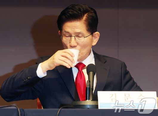(서울=뉴스1) 박세연 기자 = 김문수 국민의힘 대선 후보가 8일 서울 중구 프레스센터에서 열린 관훈클럽 토론에서 물을 마시고 있다. 2025.5.8/뉴스1 Copyright ⓒ 뉴스1. All rights reserved. 무단 전재 및 재배포, AI학습 이용 금지.