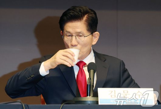 (서울=뉴스1) 박세연 기자 = 김문수 국민의힘 대선 후보가 8일 서울 중구 프레스센터에서 열린 관훈클럽 토론에 참석해 기조연설 전 물을 마시고 있다. 2025.5.8/뉴스1