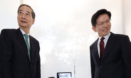 한덕수 무소속 대통령 후보와 김문수 국민의힘 대통령 후보가 7일 서울 종로구의 한 식당에서 후보 단일화 관련 회동을 하고 있다. 연합뉴스 |