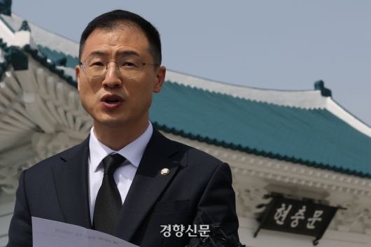 김상욱 국민의힘 의원이 8일 서울 동작구 현충원에서 참배한 뒤 탈당 입장을 밝히고 있다. 성동훈 기자 |