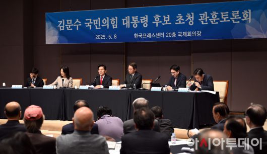 아시아투데이 박성일 기자 = 김문수 국민의힘 대선 후보가 8일 오전 서울 중구 프레스센터에서 열린 관훈클럽 토론에 참석해 기조연설을 하고 있다. ⓒ "젊은 파워, 모바일 넘버원 아시아투데이"