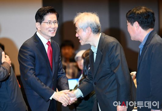 아시아투데이 박성일 기자 = 김문수 국민의힘 대선 후보가 8일 오전 서울 중구 프레스센터에서 열린 관훈클럽 토론에 참석해 참석자들과 인사하고 있다. ⓒ "젊은 파워, 모바일 넘버원 아시아투데이"