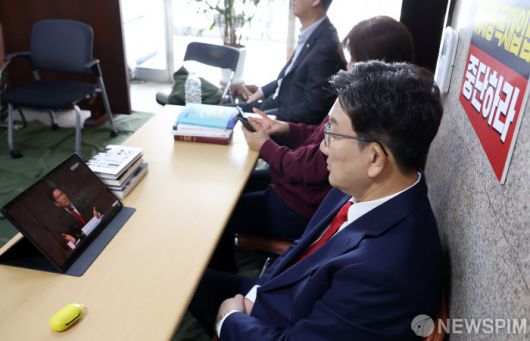 [서울=뉴스핌] 정일구 기자 = 권성동 국민의힘 원내대표가 8일 오전 서울 여의도 국회 원내대표실 앞에서 김문수 당 대선후보와 한덕수 무소속 대선 예비후보 간 단일화를 촉구하는 단식 농성을 하며 김 후보의 관훈클럽 토론을 시청하고 있다. 2025.05.08 mironj19@newspim.com
