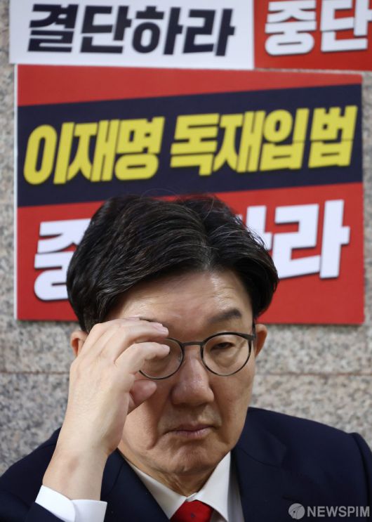 [서울=뉴스핌] 정일구 기자 = 권성동 국민의힘 원내대표가 8일 오전 서울 여의도 국회 원내대표실 앞에서 김문수 당 대선후보와 한덕수 무소속 대선 예비후보 간 단일화를 촉구하는 단식 농성을 하고 있다. 2025.05.08 mironj19@newspim.com