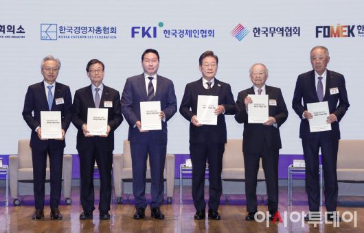 이재명 더불어민주당 대선후보가 8일 서울 중구 대한상공회의소에서 열린 대선후보 초청 경제5단체 간담회에서 경제5단체장에게 정책 제언집을 전달 받은 후 기념촬영을 하고 있다. 왼쪽부터 최진식 한국중견기업연합회장, 윤진식 한국무역협회장, 최태원 대한상공회의소 회장, 이재명 후보, 손경식 한국경영자총협회장, 류진 한국경제인협회장. /국회사진취재단