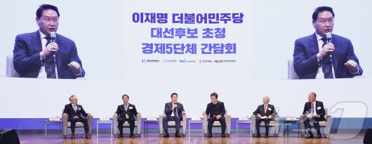(서울=뉴스1) 국회사진취재단 = 최태원 대한상공회의소 회장이 8일 서울 중구 대한상공회의소에서 열린 이재명 더불어민주당 대선후보 초청 경제5단체 간담회에서 정책 제언을 하고 있다. 2025.5.8/뉴스1photo@news1.krCopyright ⓒ 뉴스1. All rights reserved. 무단 전재 및 재배포, AI학습 이용 금지.