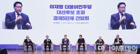 최태원 대한상공회의소 회장이 8일 서울 중구 대한상공회의소에서 열린 이재명 더불어민주당 대선후보 초청 경제5단체 간담회에서 정책 제언을 하고 있다. /국회사진취재단