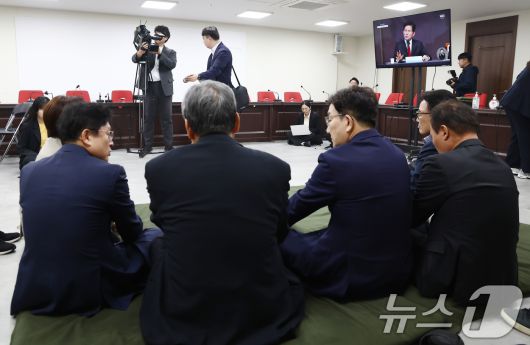 (서울=뉴스1) 김민지 기자 = 김문수 국민의힘 대통령 후보에게 단일화 약속을 촉구하며 무기한 단식에 돌입한 권성동 원내대표가 8일 오전 서울 여의도 중앙당사에서 같은 이유로 단식 농성에 들어간 김무성, 류준상 상임고문을 만나고 있다. 오른편에는 김 후보의 관훈토론회 모습이 생중계로 나오고 있는 모습. 2025.5.8/뉴스1