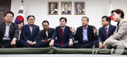 (서울=뉴스1) 김민지 기자 = 김문수 국민의힘 대통령 후보에게 단일화 약속을 촉구하며 무기한 단식에 돌입한 권성동 원내대표가 8일 오전 서울 여의도 중앙당사에서 같은 이유로 단식 농성에 들어간 김무성, 류준상 상임고문을 만나고 있다. 2025.5.8/뉴스1