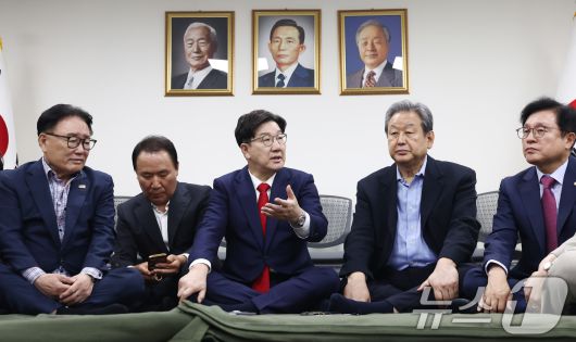 (서울=뉴스1) 김민지 기자 = 김문수 국민의힘 대통령 후보에게 단일화 약속을 촉구하며 무기한 단식에 돌입한 권성동 원내대표가 8일 오전 서울 여의도 중앙당사에서 같은 이유로 단식 농성에 들어간 김무성, 류준상 상임고문을 만나고 있다. 2025.5.8/뉴스1