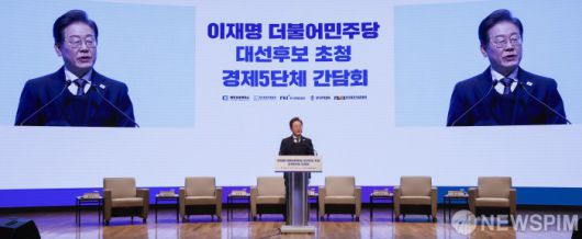 [서울=뉴스핌] 국회사진취재단 = 이재명 더불어민주당 대선 후보가 8일 오전 서울 중구 대한상공회의소에서 열린 이재명 후보 초청 경제5단체 간담회에서 발언을 하고 있다. 2025.05.08 photo@newspim.com