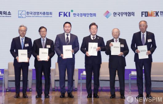 [서울=뉴스핌] 국회사진취재단 = 이재명 더불어민주당 대선 후보가 8일 오전 서울 중구 대한상공회의소에서 열린 이재명 후보 초청 경제5단체 간담회에서 경제5단체장들에게 정책 제언집을 전달 받은 뒤 기념촬영을 하고 있다. 왼쪽부터 최진식 한국중견기업연합회장, 윤진식 한국무역협회장, 최태원 대한상공회의소 회장, 이 후보, 손경식 한국경영자총협회장, 류진 한국경제인협회장. 2025.05.08 photo@newspim.com