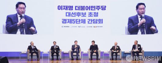 [서울=뉴스핌] 국회사진취재단 = 최태원 대한상공회의소 회장이 8일 오전 서울 중구 대한상공회의소에서 열린 이재명 더불어민주당 대선후보 초청 경제5단체 간담회에서 정책 제언을 하고 있다. 2025.05.08 photo@newspim.com
