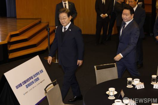 [서울=뉴스핌] 국회사진취재단 = 이재명 더불어민주당 대선 후보와 최태원 대한상공회의소 회장이 8일 오전 서울 중구 대한상공회의소에서 열린 이재명 후보 초청 경제5단체 간담회에 참석하고 있다. 2025.05.08 photo@newspim.com |