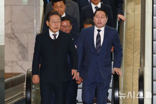 [서울=뉴시스] 국회사진기자단 = 이재명 더불어민주당 대선후보가 8일 오전 서울 중구 대한상공회의소에서 열린 대선후보 초청 경제5단체장 간담회에 최태원 대한상의 회장과 함께 참석하고 있다. 2025.05.08. xconfind@newsis.com |