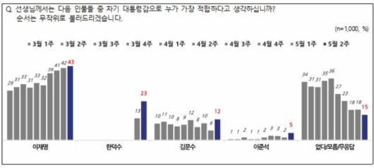 대선 후보 호감도 조사에서는 이재명(43%), 한덕수(36%), 김문수(28%), 이준석(17%) 후보 차례로 호감이 높다고 조사됐다.