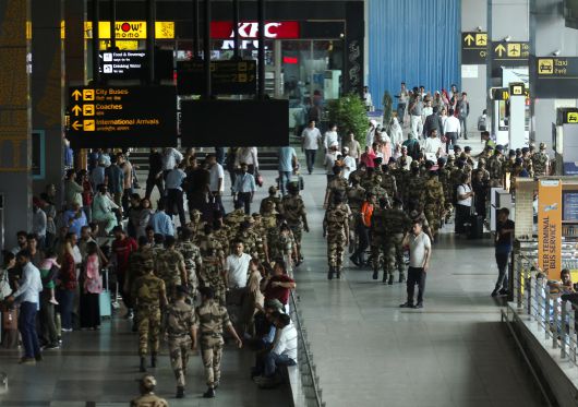 인도 수도 델리의 인드라 간디 공항에 공항 치안을 유지하기 위한 정부군이 파견돼 있다. /연합뉴스 |