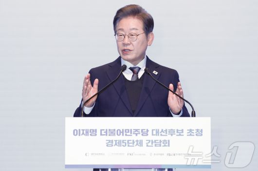 이재명 더불어민주당 대선후보가 8일 오전 서울 중구 대한상공회의소에서 열린 대선후보 초청 경제5단체장 간담회에서 발언하고 있다. 2025.5.8/뉴스1 ⓒ News1 국회사진취재단 |