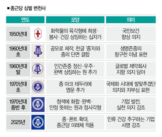 CI는 기업의 정체성과 존재감을 알리는 일종의 도구다. 이 때문에 CI 변천사를 보면 종근당의 DNA를 역추적할 수 있다. 그렇다면 종근당의 '반세기' 간의 CI는 어떤 모습이었을까. 종근당의 첫 심벌마크는 1950년대 화합물을 상징하는 육각형 안에 희생·봉사·건강을 상징하는 십자(+)를 넣어 만들었다. 한국전쟁 후 열악한 환경에서 제약업으로 국민보건 향상에 앞장서겠다는 의지를 표현했다.