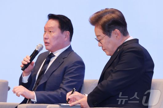 (서울=뉴스1) 국회사진취재단 = 이재명 더불어민주당 대통령선거 후보가 8일 오전 서울 중구 대한상공회의소에서 열린 경제5단체장과 간담회에서 최태원 대한상의 회장의 정책제언을 메모 하고 있다. 2025.5.8/뉴스1photo@news1.krCopyright ⓒ 뉴스1. All rights reserved. 무단 전재 및 재배포, AI학습 이용 금지.