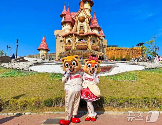 롯데자이언츠 캐릭터 로티와 로리가 롯데자이언츠 유니폼을 입고 기념사진을 찍고 있다.(롯데월드 부산 제공. 재판매 및 DB 금지) |
