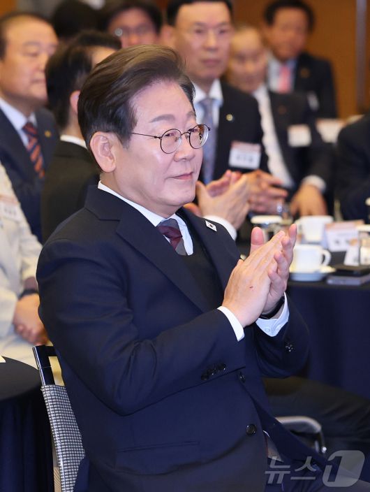 (서울=뉴스1) 국회사진취재단 = 이재명 더불어민주당 대통령선거 후보가 8일 오전 서울 중구 대한상공회의소에서 열린 경제5단체장과의 간담회에 참석해 최태원 대한상공회의소 회장의 환영사를 듣고 박수치고 있다. 2025.5.8/뉴스1photo@news1.krCopyright ⓒ 뉴스1. All rights reserved. 무단 전재 및 재배포, AI학습 이용 금지.