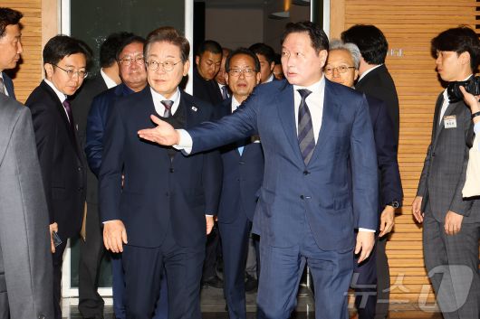(서울=뉴스1) 국회사진취재단 = 이재명 더불어민주당 대선후보가 8일 오전 서울 중구 대한상공회의소에서 열린 대선후보 초청 경제5단체장 간담회에 참석해 최태원 대한상의 회장의 안내를 받고 있다. 2025.5.8/뉴스1photo@news1.krCopyright ⓒ 뉴스1. All rights reserved. 무단 전재 및 재배포, AI학습 이용 금지.