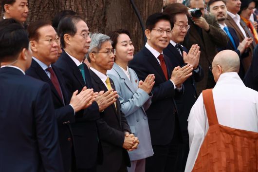 이재명 더불어민주당 대통령 후보(오른쪽부터)와 김문수 국민의힘 대통령 후보, 한덕수 무소속 대통령 선거 예비 후보(왼쪽 세번째) 등 참석자들이 5일 오전 서울 종로구 조계사에서 열린 불기 2569년 부처님오신날 봉축법요식에서 합장하고 있다. 뉴스1 |