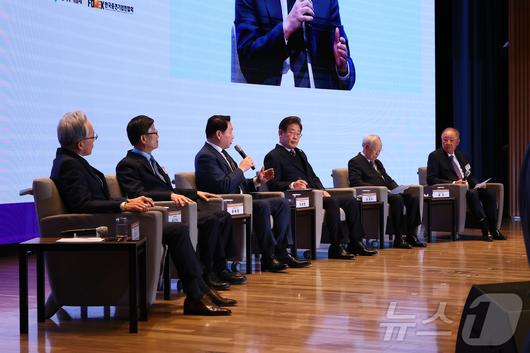 (서울=뉴스1) 국회사진취재단 = 최태원 대한상의 회장이 8일 오전 서울 중구 대한상공회의소에서 열린 이재명 더불어민주당 대선후보 초청 경제5단체장 간담회에서 정책 제언을 하고 있다. 2025.5.8/뉴스1photo@news1.krCopyright ⓒ 뉴스1. All rights reserved. 무단 전재 및 재배포, AI학습 이용 금지.