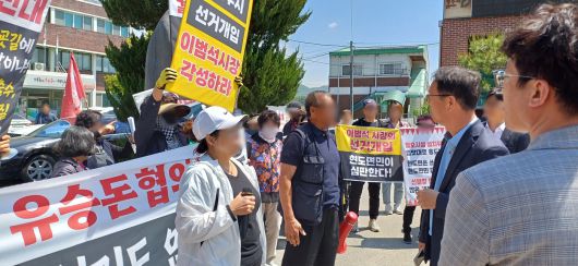 청주시의 재활용 선별센터 사업 보고회 저지하는 반대 주민들. |
