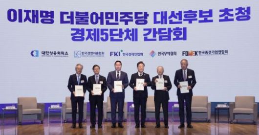 이재명 더불어민주당 대선후보가 8일 서울 중구 대한상공회의소에서 열린 이재명 더불어민주당 대선후보 초청 경제5단체 간담회에서 경제5단체장 들에게 정책 제언집을 전달 받은 후 기념촬영을 하고 있다. 왼쪽부터 최진식 한국중견기업연합회장, 윤진식 한국무역협회장, 최태원 대한상공회의소 회장, 이 후보, 손경식 한국경영자총협회장, 류진 한국경제인협회장. 2025.5.8 국회사진기자단