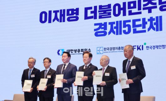 이재명 더불어민주당 대통령선거 후보가 8일 오전 서울 중구 대한상공회의소에서 열린 경제5단체장과 간담회에 참석해 정책제언집을 들고 함께 기념사진을 찍고 있다. (왼쪽부터)최진식 한국중견기업연합회 회장, 윤진식 한국무역협회 회장, 최태원 대한상공회의소 회장, 이 후보, 손경식 한국경영자총협회 회장, 류진 한국경제인연합회 회장.(사진=뉴스1) |