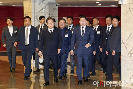 이재명 더불어민주당 대선 후보와 최태원 대한상공회의소 회장이 8일 서울 중구 대한상공회의소에서 열린 대선 후보 초청 경제5단체장 간담회에 참석하고 있다. /국회사진취재단 |