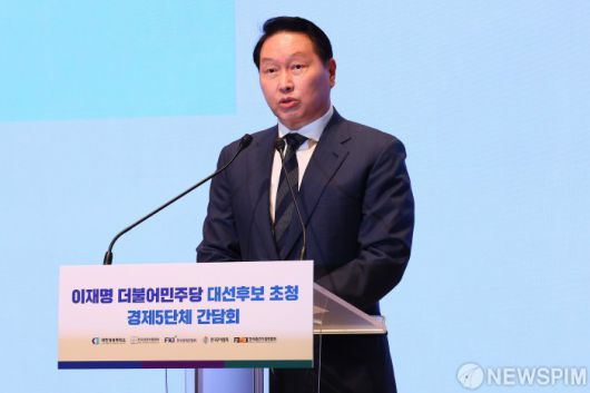 [서울=뉴스핌] 국회사진취재단 = 최태원 대한상공회의소 회장이 8일 오전 서울 중구 대한상공회의소에서 열린 이재명 더불어민주당 대선 후보 초청 경제5단체 간담회에서 환영사를 하고 있다. 2025.05.08 photo@newspim.com