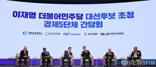 [서울=뉴스핌] 국회사진취재단 = 이재명 더불어민주당 대선후보가 8일 오전 서울 중구 대한상공회의소에서 열린 이재명 후보 초청 경제5단체 간담회에서 발언하고 있다. 2025.05.08 photo@newspim.com