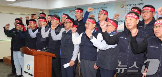 (서울=뉴스1) 장수영 기자 = 서종수 전국자동차노동조합연맹 위원장과 22개 지역 버스노조 위원장들이 8일 서울 서초구 전국자동차노동조합연맹에서 열린 서울 등 22개 지역 버스 노조 대표자 회의를 마친 뒤 구호를 외치고 있다. 서울 등 22개 지역 버스노조는 오는 12일 동시조정을 신청, 27일 자정까지 협상에 임할 것이라고 밝혔다. 협상이 결렬될 경우 지역 노조별로 28일 첫 차부터 동시 파업에 들어갈 예정이다. 2025.5.8/뉴스1