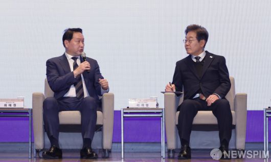 [서울=뉴스핌] 국회사진취재단 = 최태원 대한상공회의소 회장이 8일 서울 중구 대한상공회의소에서 열린 이재명 더불어민주당 대선 후보 초청 경제5단체 간담회에서 정책 제언을 하고 있다. 2025.05.08 photo@newspim.com