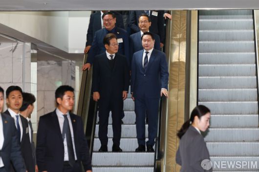 [서울=뉴스핌] 국회사진취재단 = 이재명 더불어민주당 대선 후보가 8일 오전 서울 중구 대한상공회의소에서 열린 대선후보 초청 경제5단체장 간담회에 참석하고 있다. 오른쪽은 최태원 대한상의 회장. 2025.05.08 photo@newspim.com